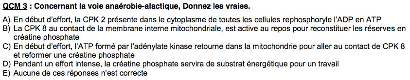 Un item totalement faux aurait été "l'hydrolyse de la liaison amidine phosphate de la crétaine phosphate fournit de l'énergie à la cellule pour un travail"...