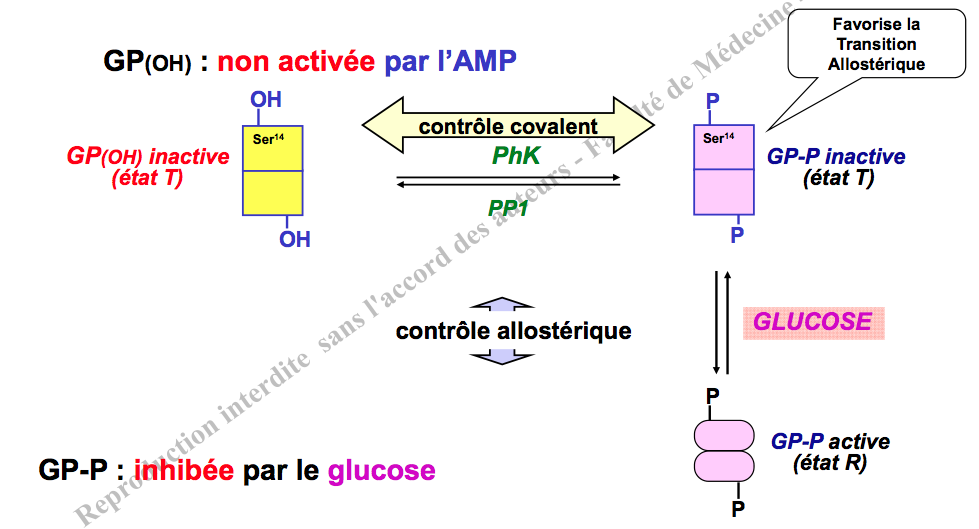 Le GP-OH dans le foie est toujours sous forme T (ou du moins la forme R est quasi inexistante) puisqu'il n'existe aucun effecteur allostérique positif de la GP dans le foie capable de favoriser la transition allostérique de T vers R. Le seul facteur pouvant provoquer la transition allostérique de T vers R est la fixation de phosphate sur sérines 14 (en phase PA) :arrow: on passe de GP-OH (T) à GP-P (T) :arrow: puis transition allostérique GP-P (T) vers GP-P (R) : elle est facilitée par la fixation du phosphate.