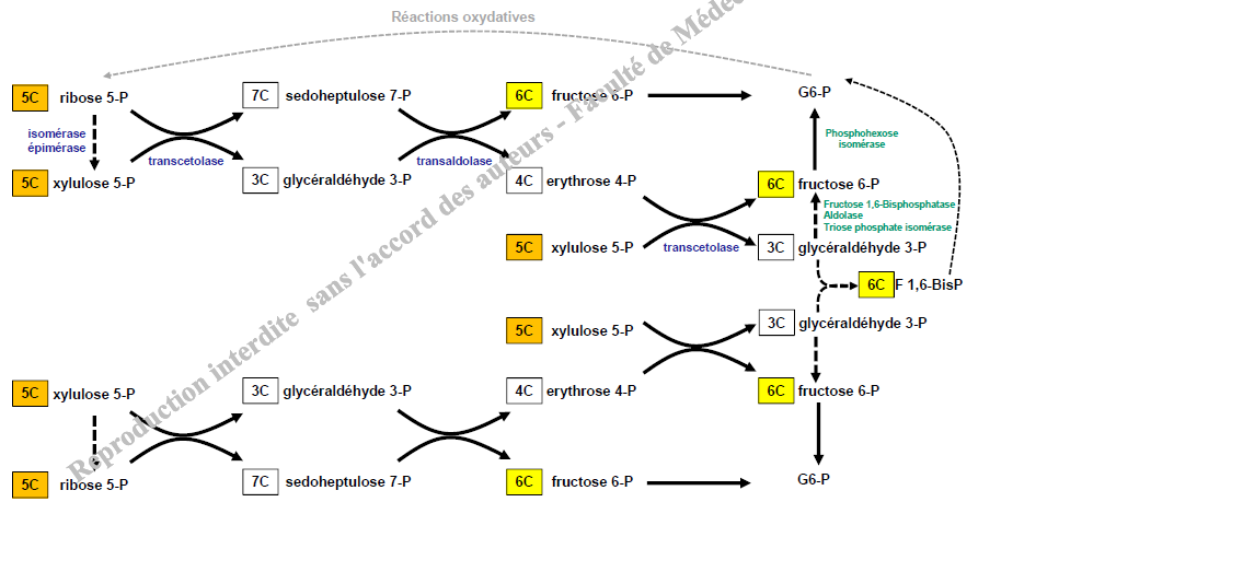 Ces produits vont ensuite soit pouvoir réintégrer la glycolyse, soit recommencer une phase oxydative de la voie des Pentoses Phosphates.