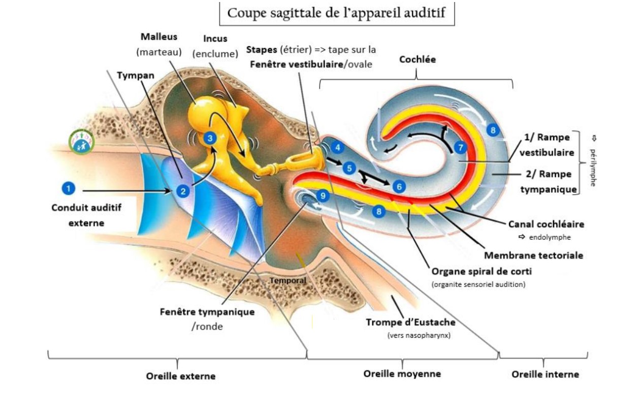 zone de sortie des vibrations sonores de la rampe tympanique de la cochlée vers l'oreille moyenneJe te remets le schéma de ma fiche qui montre bien les différentes localisations et qui va te permettre de mieux comprendre ces notions :