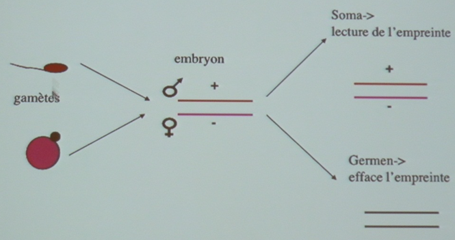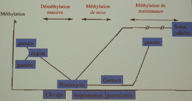 déméthylation massive ! Donc quasiment tout le génome va perdre l'empreinte parentale (de la mère et du père) sauf certaines petites parties de la chromatine. Celles qui sont spécifiques de la mère et celles qui sont spécifiques du père.