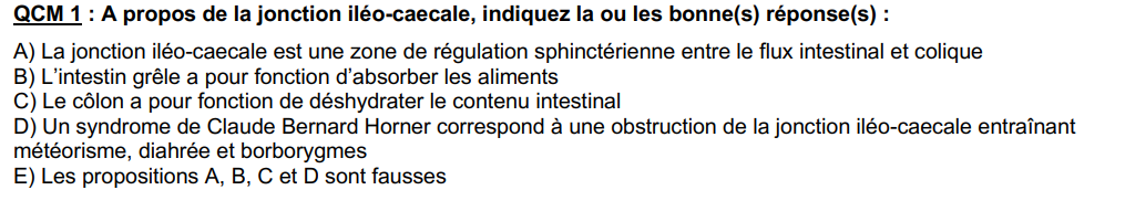 , dans les annatuts il y a ce QCM qui me pose problème, est ce que tu sais pourquoi les réponses AB sont comptées justes ?? Parce que je pensais que l'intestin grêle absorbe les "nutriments" et pas les aliments et j'ai pas non plus souvenir d'avoir vu un "sphincter" au niveau de la jonction iléo-caecale mais j'ai du mal comprendre les items ...