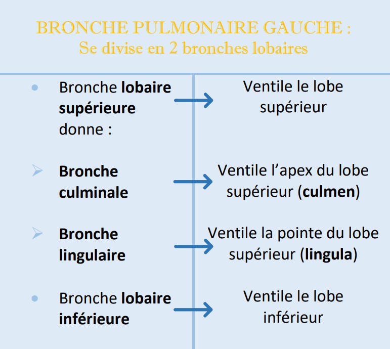 :!: Attention à ne pas confondre la base du poumon gauche (formée d'une partie du lobe supérieur et d'une partie du lobe inférieur) avec la partie inférieure du lobe supérieur (= lingula = pointe) :!: