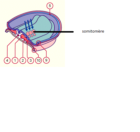 :arrow: somitomère: ce sont des pré-somites, c'est a dire que ce sont des condensations du mesoblate intraE dans le sens cranio caudale. Les 7 premiers du coté céphaliques (de la tête) ne se transformeront pas en somites les autres oui.