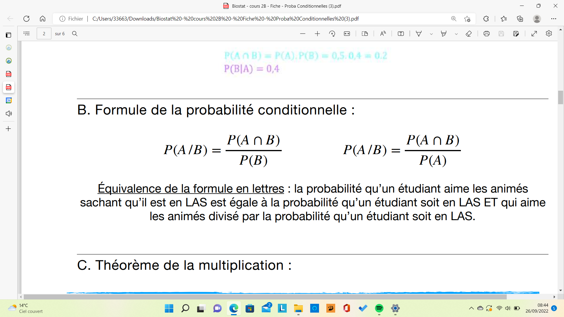 J'ai bien compris qu'il y avait équivalence des lettres mais pour la seconde formule, est ce que ça ne serait pas plutôt P(B/A) ? Parce sur la suite du cours, ça ne colle pas avec P(A/B).