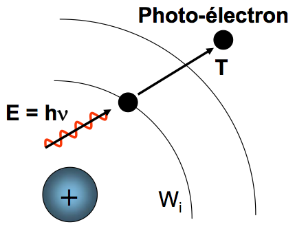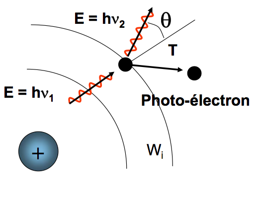 2) une autre partie de cette énergie est utilisée pour expulser un électron d'une orbitale d'une atome. Ce photo-électron part avec une énergie cinétique T qui égale à l'énergie du photon incident E=hν1 diminuée de l'énergie qui a été diffusée et donc pas utilisée E=hν2 et de l'énergie de liaison de l'électorn qui représente l'effort qu'il a fallu fournir pour l'expulser: T= hν1 – lWi| - hν2.