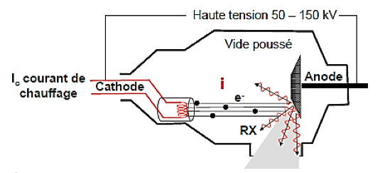 Les rayons X sont crées lors de l'interaction de ces électrons avec l'anode, lors des réarrangements électroniques de l'anode après qu'elle ait subit des ionisations/excitations sous l'effet de ces électrons. Ces photons émis (les rayons X) vont pouvoir être émis selon plusieurs direction selon leur énergie: