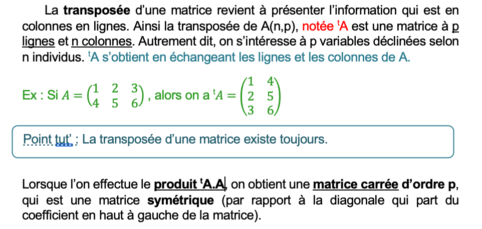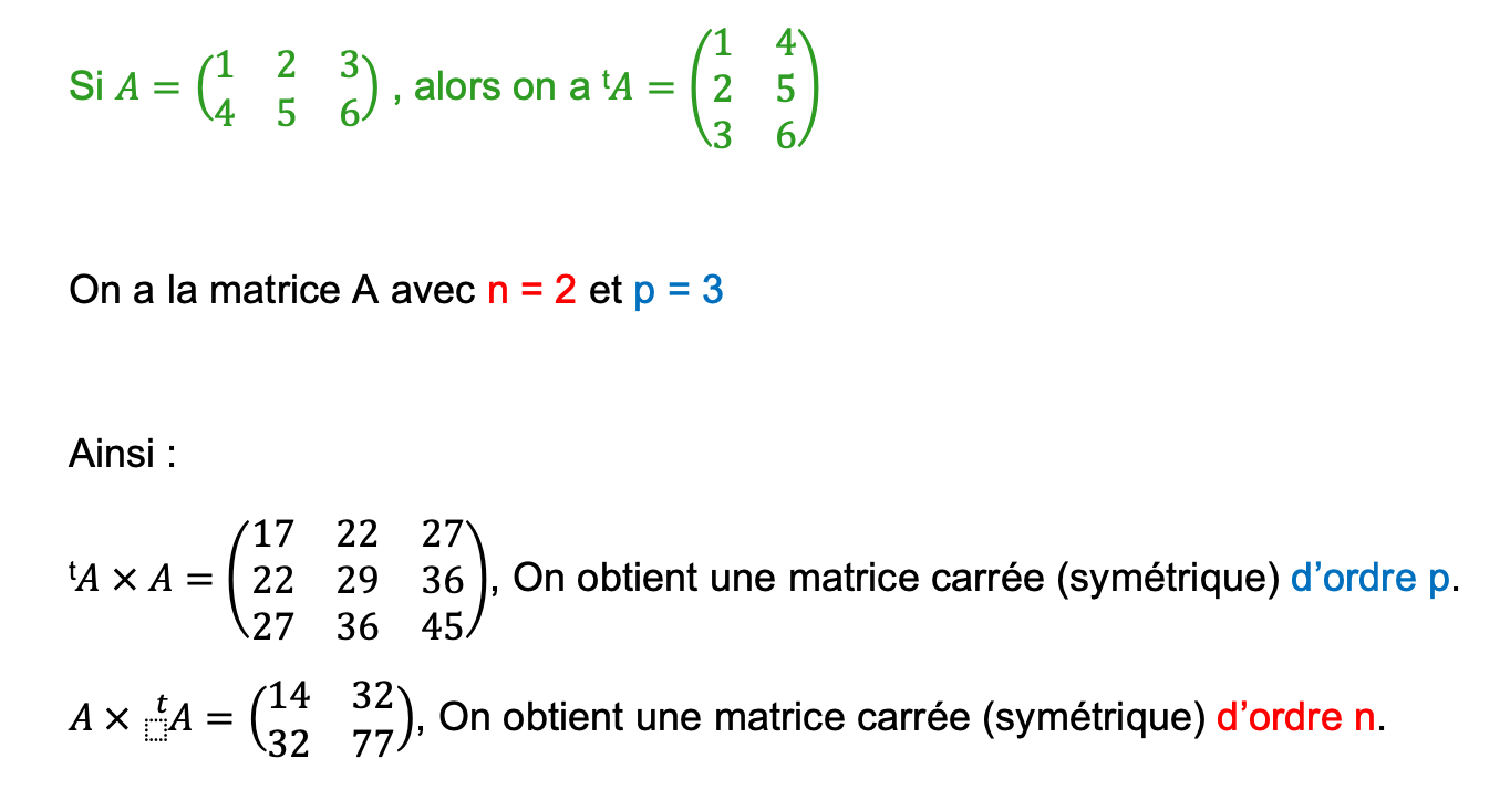 En fait : quand tu fais le produit d’une matrice par sa transposée il y a 2 produits possibles puisque t^AxA différent de Ax(t^A) (a priori, en tout cas quand ce ne sont pas des matrices carrées pour sûr).