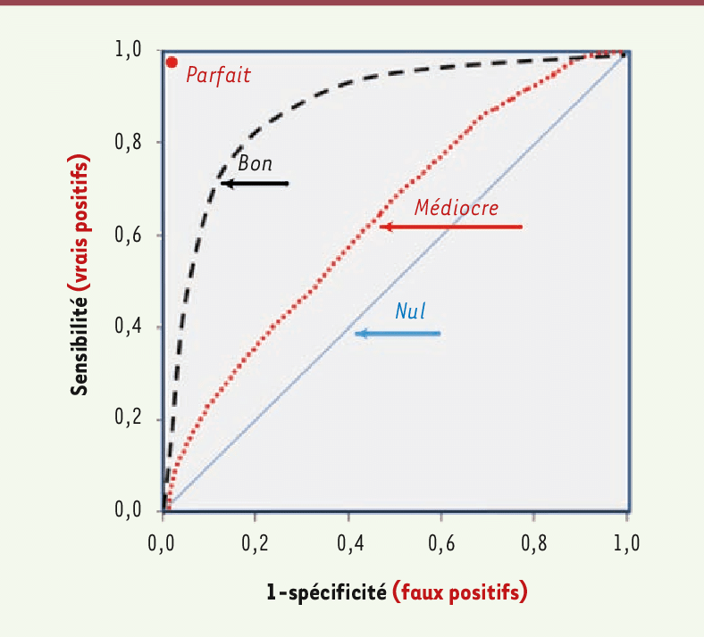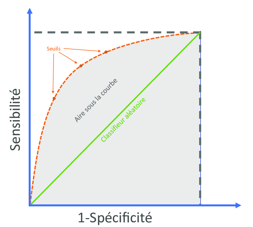 Maintenant sur la dernière image on voit bien que les deux varient ensemble, plus ma courbe se rapproche du coin en haut à gauche, plus mon aire sous la courbe augmente, et donc plus mon test est discriminant (=j’ai trouvé le seuil optimal).