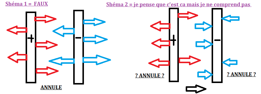 Bonjouuur, j'ai une question à poser qui va paraitre un peu bête mais simplement je n'arrive pas a comprendre comment le champs électrique s'annule a l'exterieur de deux plaques chargés + e-