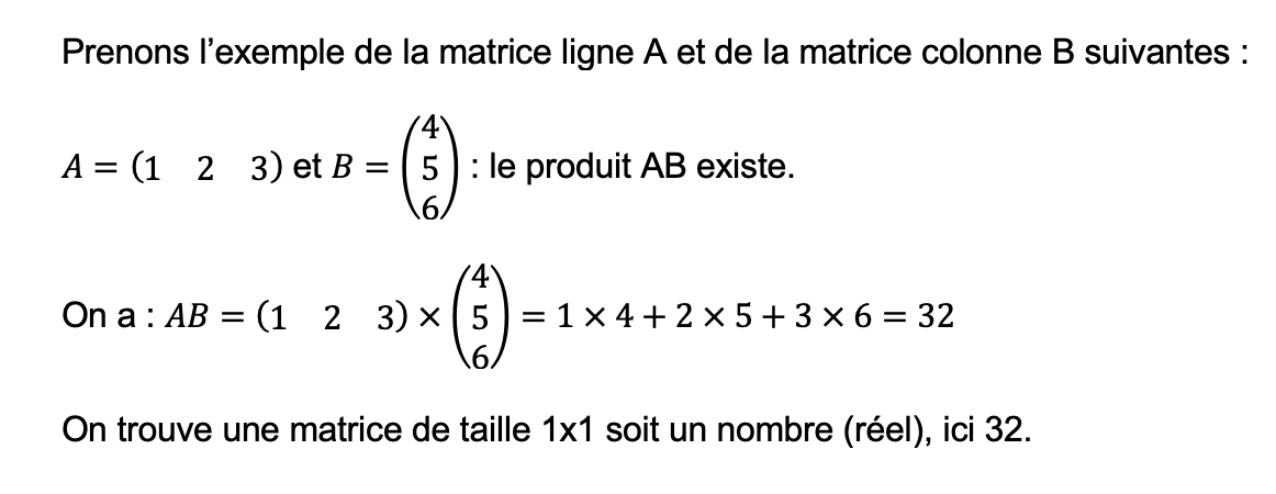 Salut, dans le dm des matrices du prof l'item 8 C est compté juste : "Si le produit AB existe alors c'est un nombre". Mais pour moi le produit donne une matrice et non pas un nombre non ?