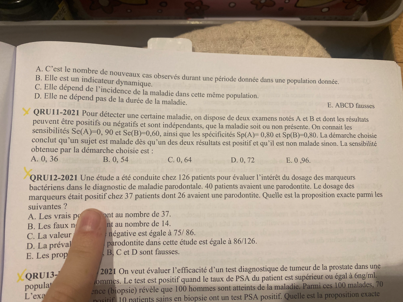 Admettons qu’on commence par le test A, on a dans les malades 90% de positifs et 10% de négatifs. Ensuite on fait le test B (sur les 10% négatifs malade puisque dans l’énoncé il est dit que 1 test positif suffit pour être compté comme malade). Donc si le premier test est positif, aucun intérêt de faire le 2ème et on a une Se de 60%. Donc dans les 10% négatifs au premier test, on aura 6% de positifs et 4% de négatifs suite au second test. Au final on a donc 96% de personnes qui sont positives parmi les malades = une Se de 96% → réponse E. On peut faire pareil en faisant le test B en premier→même résultat.