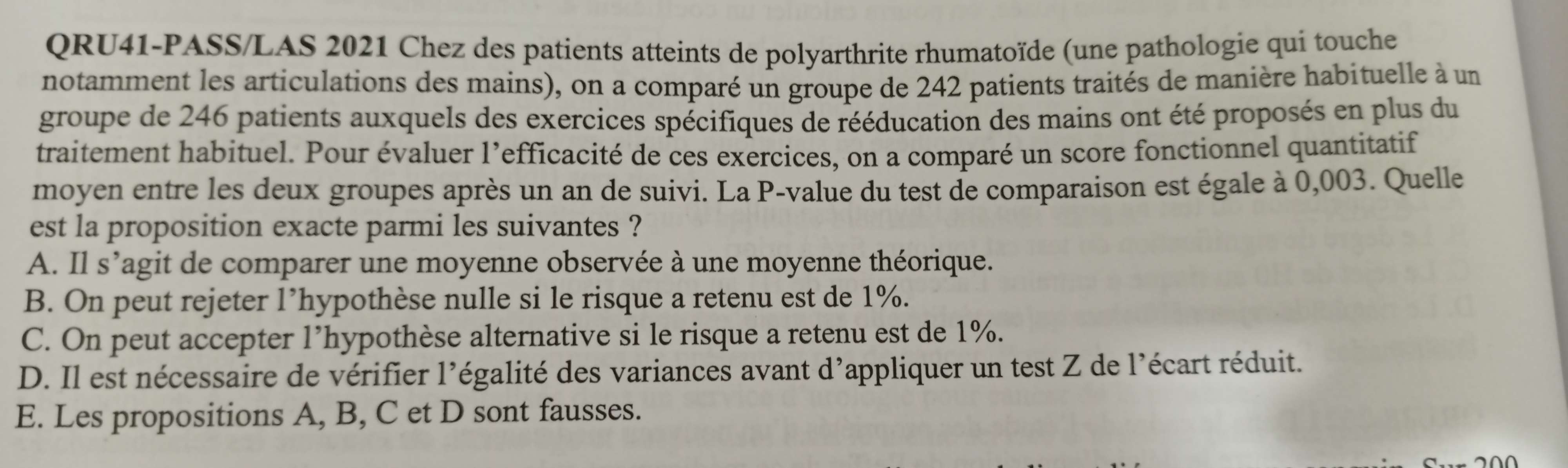 Déjà tu peux oublier la p-value car ce n'est plus au programme. Tu ne peux donc par répondre aux items B et C