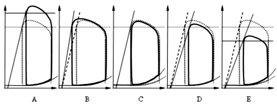 QCM 18 : Soit la boucle pression-volume du ventricule gauche : quelle est celle qui correspond à une diminution isolée de la compliance? (situation initiale en pointillés ; situation après diminution de la compliance en traits pleins)