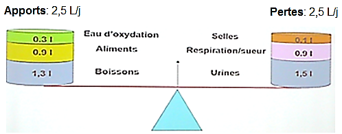 D) Les apports et pertes sont d’environ 2,5 L/j (2,5L/j c'est que les pertes)