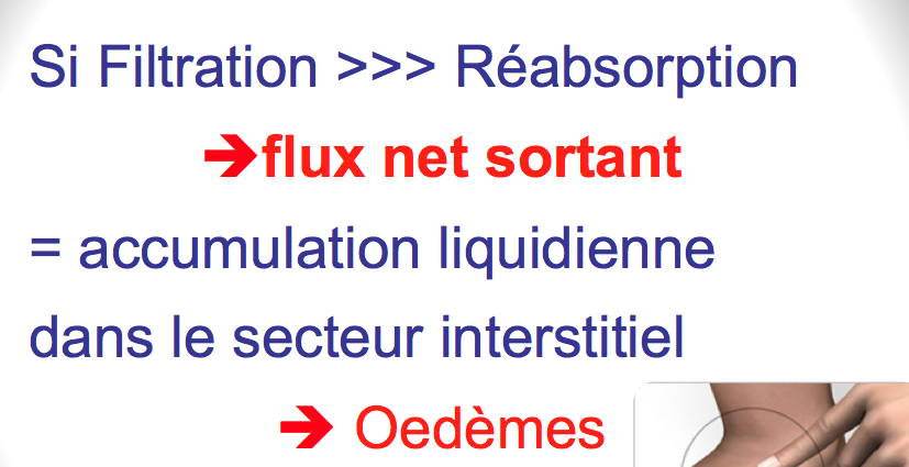 Lors d'un oedeme, tu vas avoir une plus grande filtration, (que réabsorption) donc, un plus grand flux net sortant (alors que reabsorption c'est l'inverse) qui va entrainer une accumulation de liquide dans le secteur interstitiel! :arrow: OEDEME