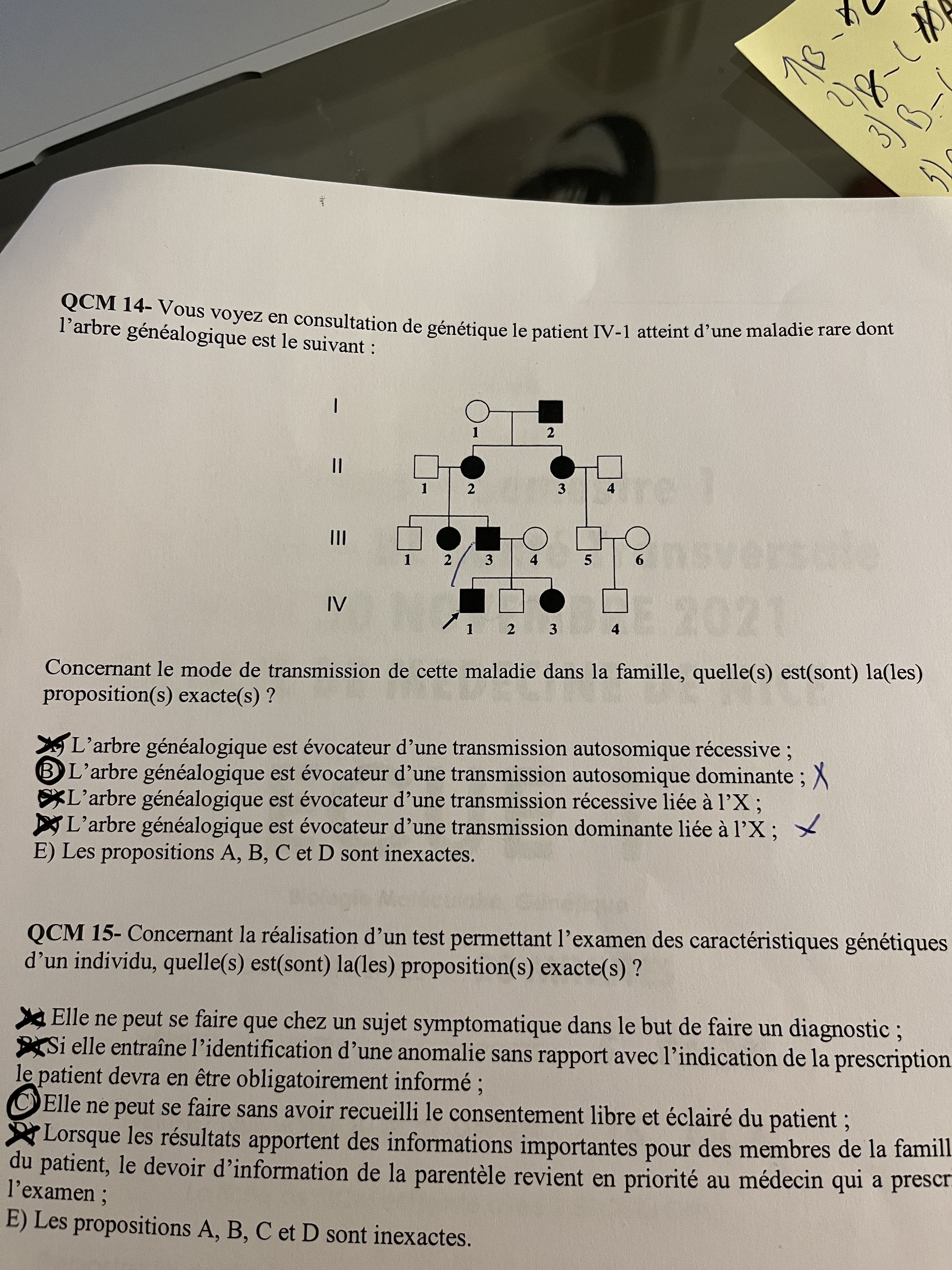 Il est dit dans le cours que "toutes les filles d'un homme sont atteintes, tous les garçons sont indemnes" donc pour moi cet arbre serait évocateur d'une transmission autosomique dominante