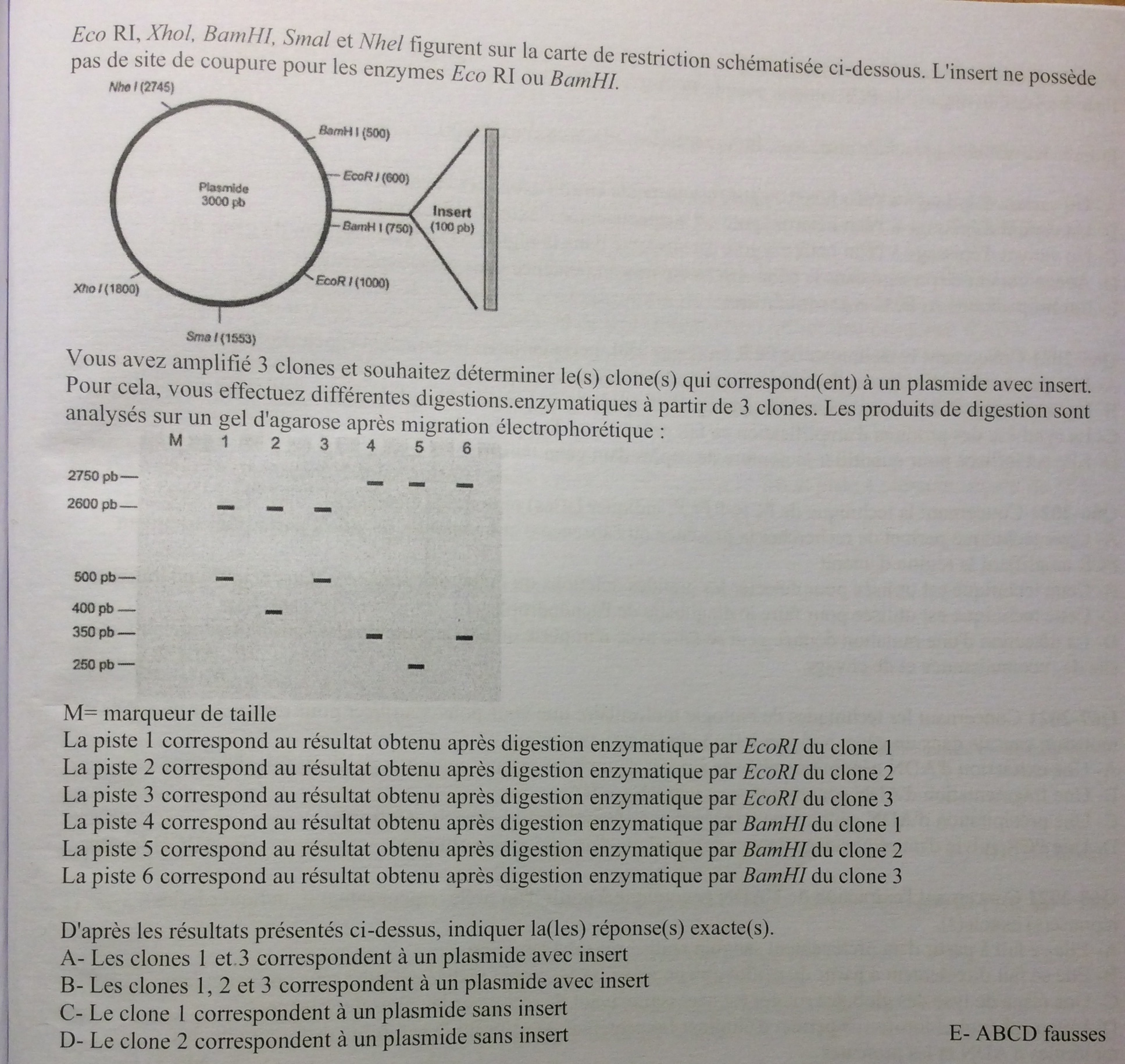 Bonjour, à propos de cet item "Le clone 2 corespondant à un plasmide sans insert" a été compté "FAUX" et je ne comprends pas pourquoi.En effet, en comptant les amplicons par migration électrophorétique on voit bien que la somme correspond à un plasmide sans insert.Du coup, je me demande si il y a eu quelque chose que je n'ai pas compris sur ce qcm.