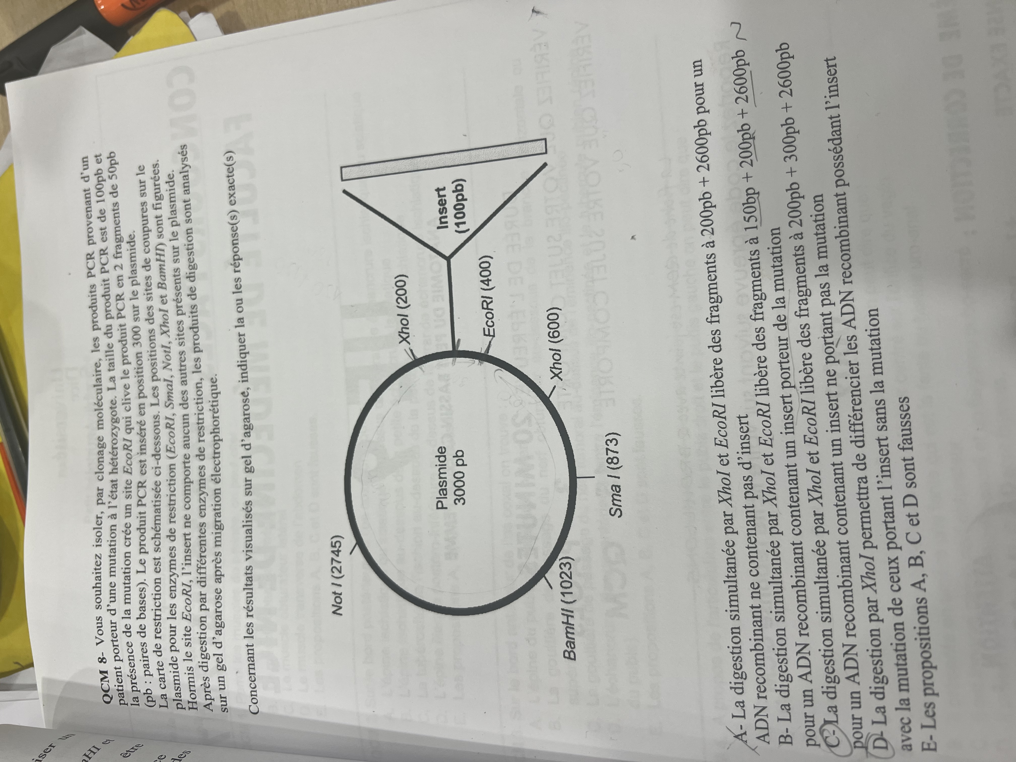 La D est fausse pour moi car Xho1 n'a pas de site de clivage sur l'insert, il nous permet pas de savoir si la mutation est présente alors qu' EcoR1 possède 1 site de clivage sur l'insert et coupe si la mutation est présente (cf. énoncé).