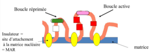 Insulateur : inhibe l’action des enhancers et silences et permettent donc d’éviter que leur action se propage sur plusieurs boucles, ce qui empêchent l’inhibition ou l’activation de boucles qui ne présentent pas de silencer ou encore enhancer