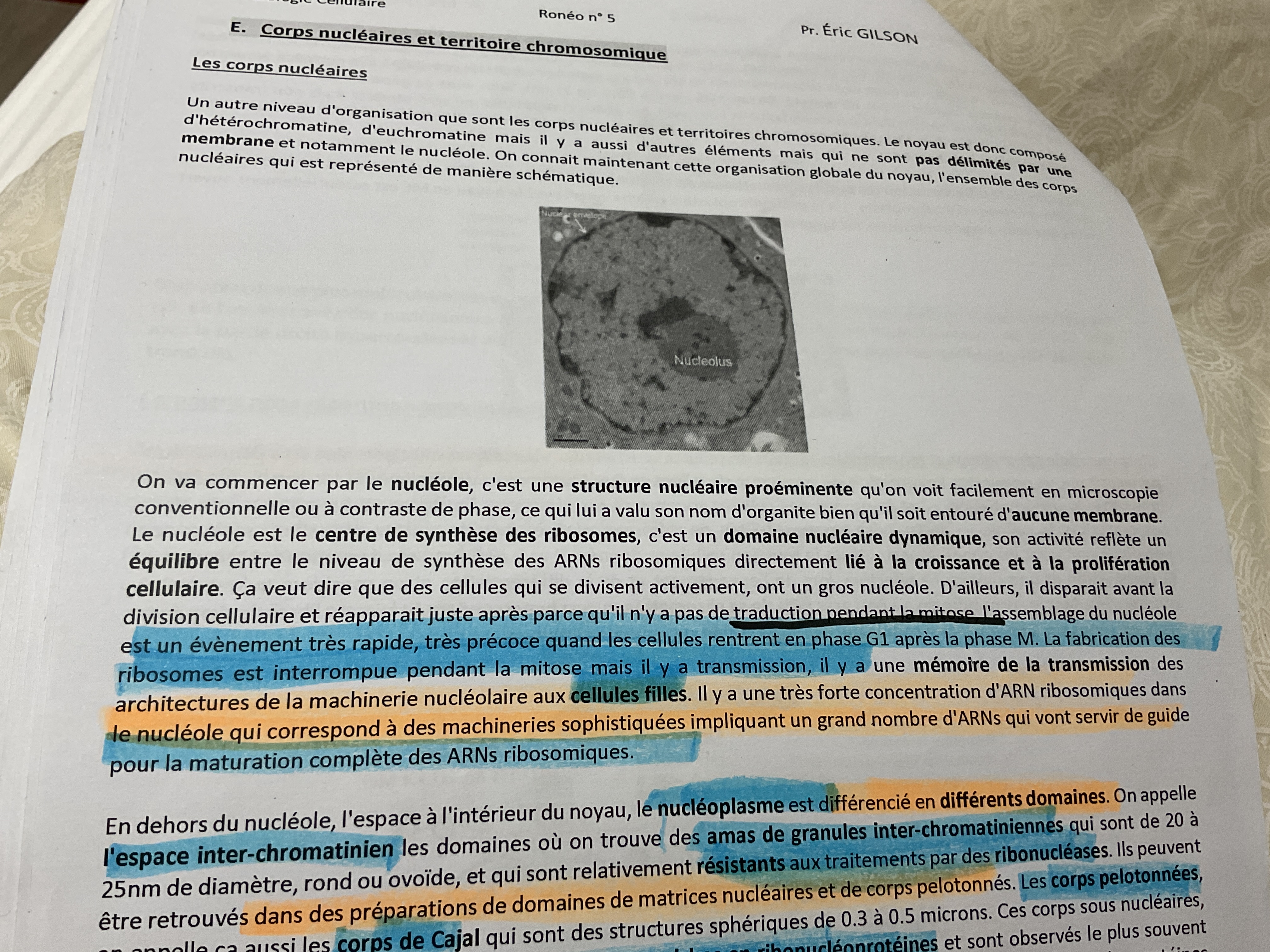Coucou je ne comprend pas trop se passage dans la ronéo il est dit que le nucléole est le lieu de synthése des arns ribozomiques et que durant la mitose elle disparaît parcequ’il n’y pas de traduction pendant la mitose.