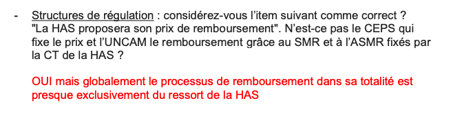 C'est faux ! La phrase est un peu ambiguë parce que prix de remboursement ça veut tout et rien dire ... et même si on essaye de l'interpréter de plusieurs façons ça ne marche pas. La HAS propose le remboursement ça oui mais c'est l'UNCAM qui se charge de fixer le taux de remboursement ! Et quand au prix d'un médicament c'est le CEPS qui s'en charge en s'aidant de l'ASMR fixé par la HAS certes mais ce n'est pas elle qui va le fixer.