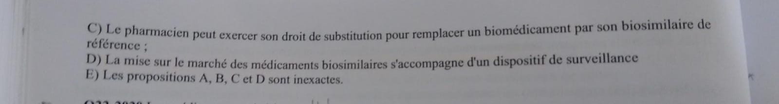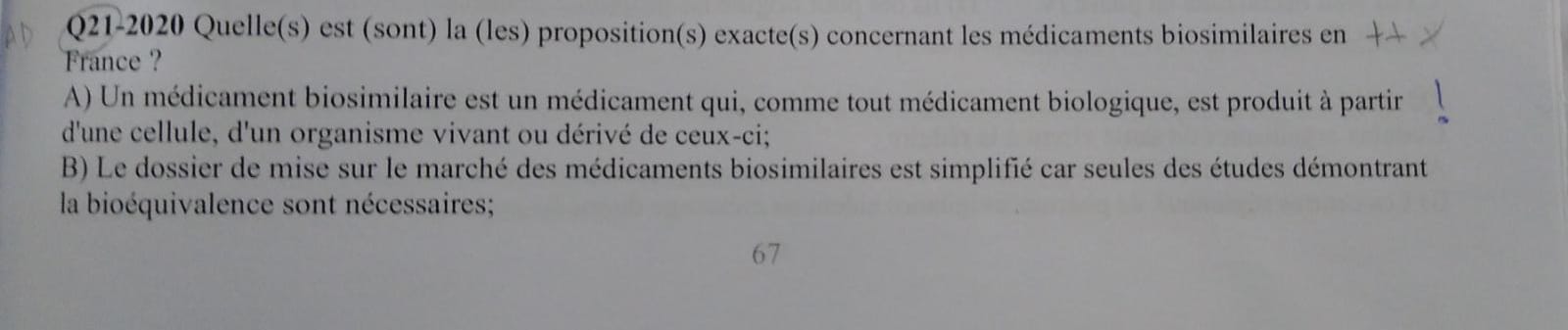 Ensuite, Pour l'item B l'AMM d'une médicament bio similaire ne répond pas qu'à des normes de bioéquivalence il faut qu'il réponde également à des normes de sécurité, d'efficacité clinique et de qualité presque comme pour un Nouveau Princeps.