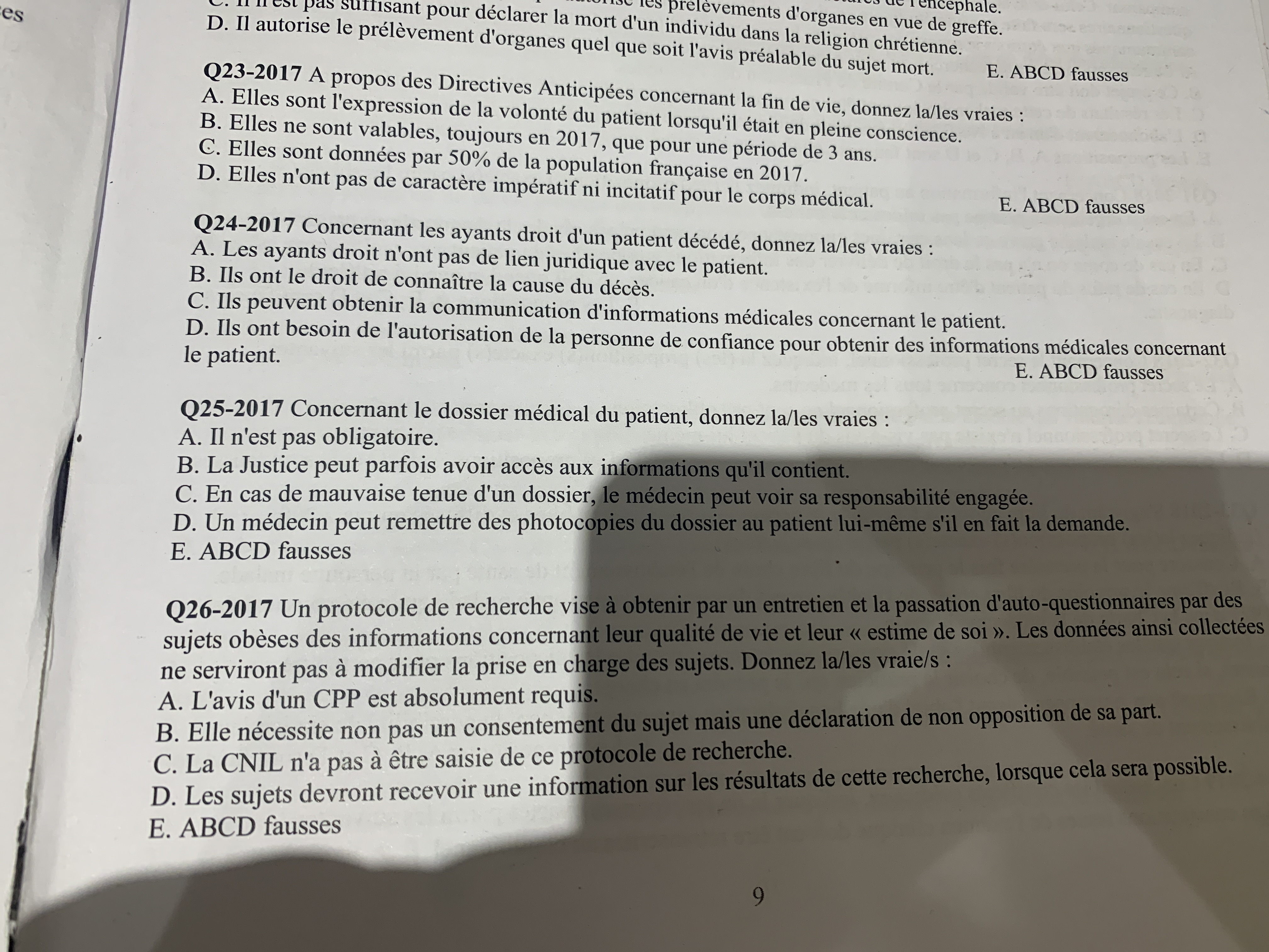 Pour le QCM 24, j'aurais mis BC: - l'item A est faux car les ayants droits ont un lien juridique (ce sont des héritiers du patient tels que les enfant, mari/femme, frère/soeur etc...).
