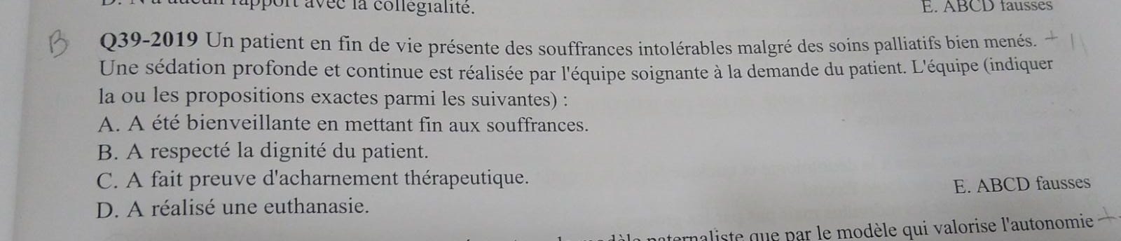 Coucou alors je pense que le piège est dans le terme de bienveillance (car on parle plus du principe de bienfaisance ) . Dans son cours le prof a aucun moment n'évoque le terme de bienveillance meme si c'est un synonyme .