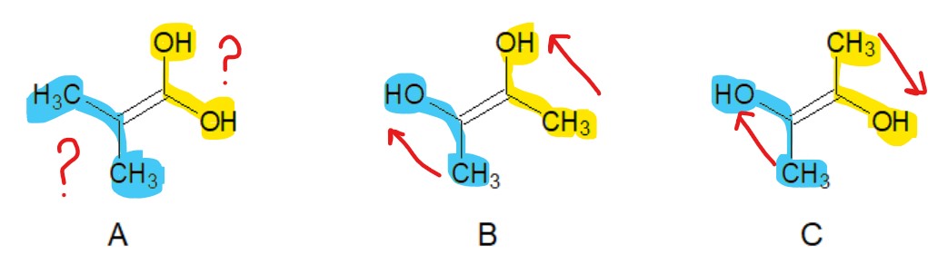- En effet, le carbone à gauche de la double liaison est lié au 2 même groupements : 2 CH3, tu ne peux pas établir de priorité entre 2 CH3 vu que ce sont les 2 mêmes. - Pareil pour le carbone à droite de la double liaison, tu auras 2 OH qui ne sont pas ordonnable l'un par rapport à l'autre.
