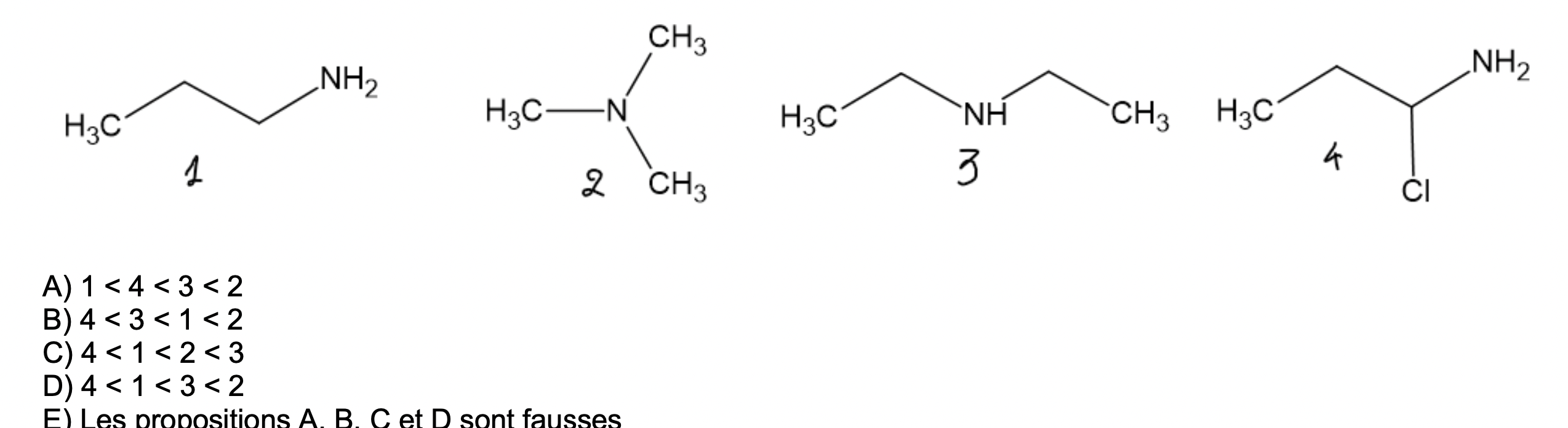 Hello bon c'est un peu bizarre car j'ai trouvé le bon ordre mais je ne comprends pas trop trop la justification pour la molécule 4. Vous dessinez un effet inductif donneur du NH2 vers le Cl, cependant si j'ai bien compris, le cl reste moins électronégatif que le N (F>N>CL>BR etc etc) donc, cela voudrait dire (en tout cas dans ma tête) qu'il existe toujours un très léger effet inductif du Cl vers le N ce qui donnerai un caractère encore basique à la molécule mais bien moins basique que toutes les autres...Ducoup est ce que ce serai possible d'expliquer juste pourquoi il existe un effet allant du NH au Cl svp ? Merci d'avance et merci pour votre travail ce semestre ! :coeur: (je vous met l'item en pj).