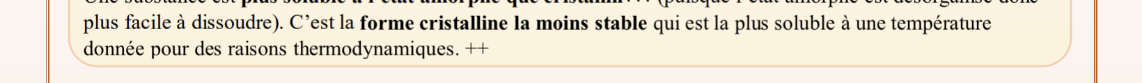 Et la solubilité des différentes formes cristallines est due à leur stabilité, donc moins une forme cristalline est stable, plus elle est soluble, mais même la forme cristalline la moins stable sera quand même moins soluble qu'une forme amorphe pour une même molécule.