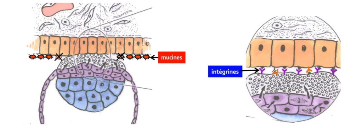 Tout d'abord, il faut savoir que les mucines sont des composants du glycocalyx que l'on retrouve à la surface des cellules épithéliales de l'endomètre. Entre les mucines et la surface des cellules épithéliales se trouvent des molécules d'adhérences, à savoir les intégrines.