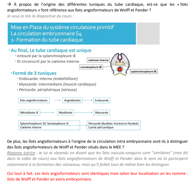 J'ai lu la SDR de cette année et est-ce que vous pourriez me confirmer que l'endocarde dérive des îlots angioformateurs (=vasculo-sanguins, MIE) et pas des îlots angioformateurs de Wolf et Pander (MEE) ? je ne suis pas sûre d'avoir vraiment compris..