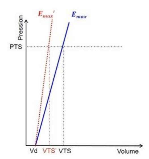 Maintenant si la postcharge augmente, on est plus du tout dans le même cas ! Si la postcharge augmente, la PTS augmente, le VTS augmente et le VES diminue ! En plus page 15 on a pas du tout une augmentation de la contractilité, qui reste la même (la pente de Emax reste la même = la contractilité reste la même)