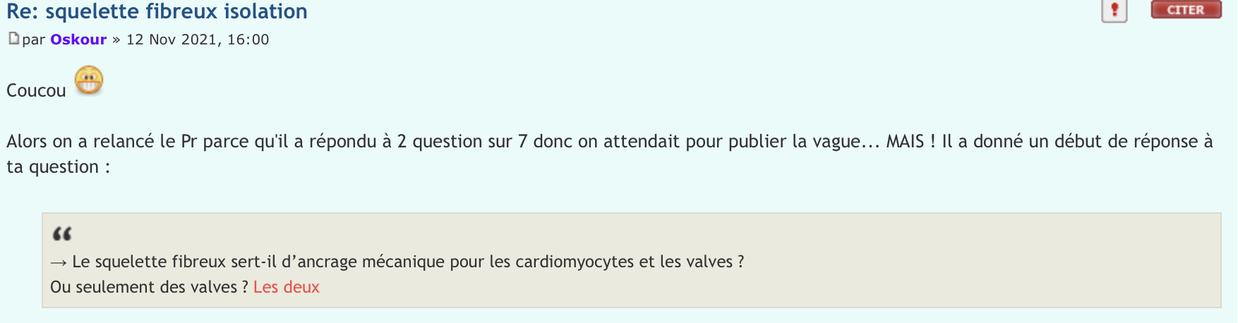 1)Dans deux Qcm différents, un en 2016 et un en 2021, on a deux réponses différentes au sujet de l’ancrage des cardiomyocytes sur le squelette fibreux du cœur, l’un dit oui l’autre dit non.