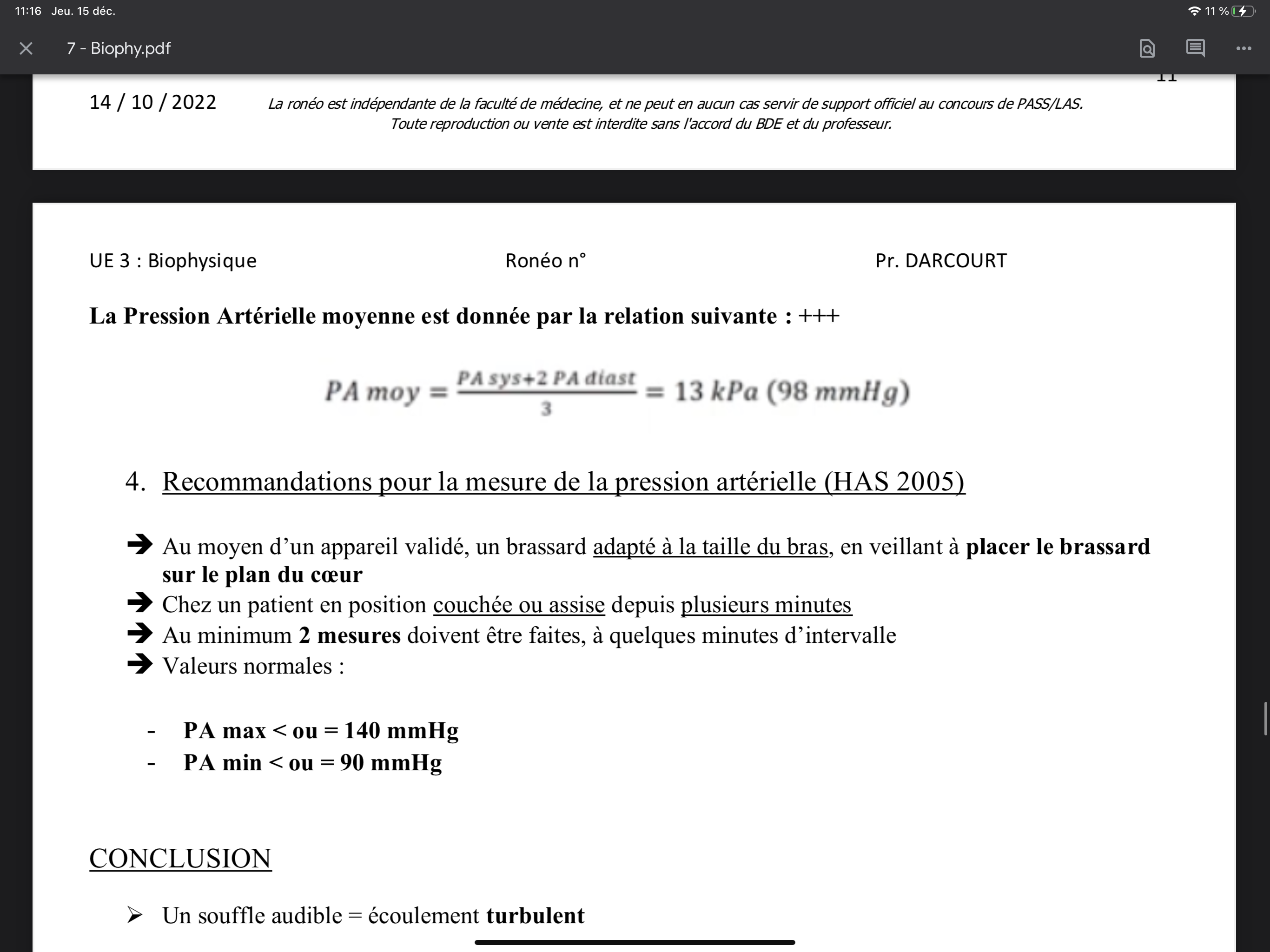 QCM 1 : Un patient arrive aux urgences et vous êtes l’interne de garde. Vous devez calculer la pression artérielle du patient sachant que sa pression artérielle diastolique est de 75mmHg et que sa pression artérielle systolique est de 16 000 Pa ? :) je n'es pas très bien compris la correction lorsque vous diviser par 133 (P sys = 16 000 Pa = 16 000 / 133) et aussi le calcule d'après quand vous multiplier par deux le P diastolique et que vous diviser tt par trois @@ et pour finir j'me demander si c'est premier qcm était bien sur le cours BIOPHY CARDIAQUE car sur BIOPHY DE LA CIRCULATION il n'y a aucun cours en dessus ;) Merci