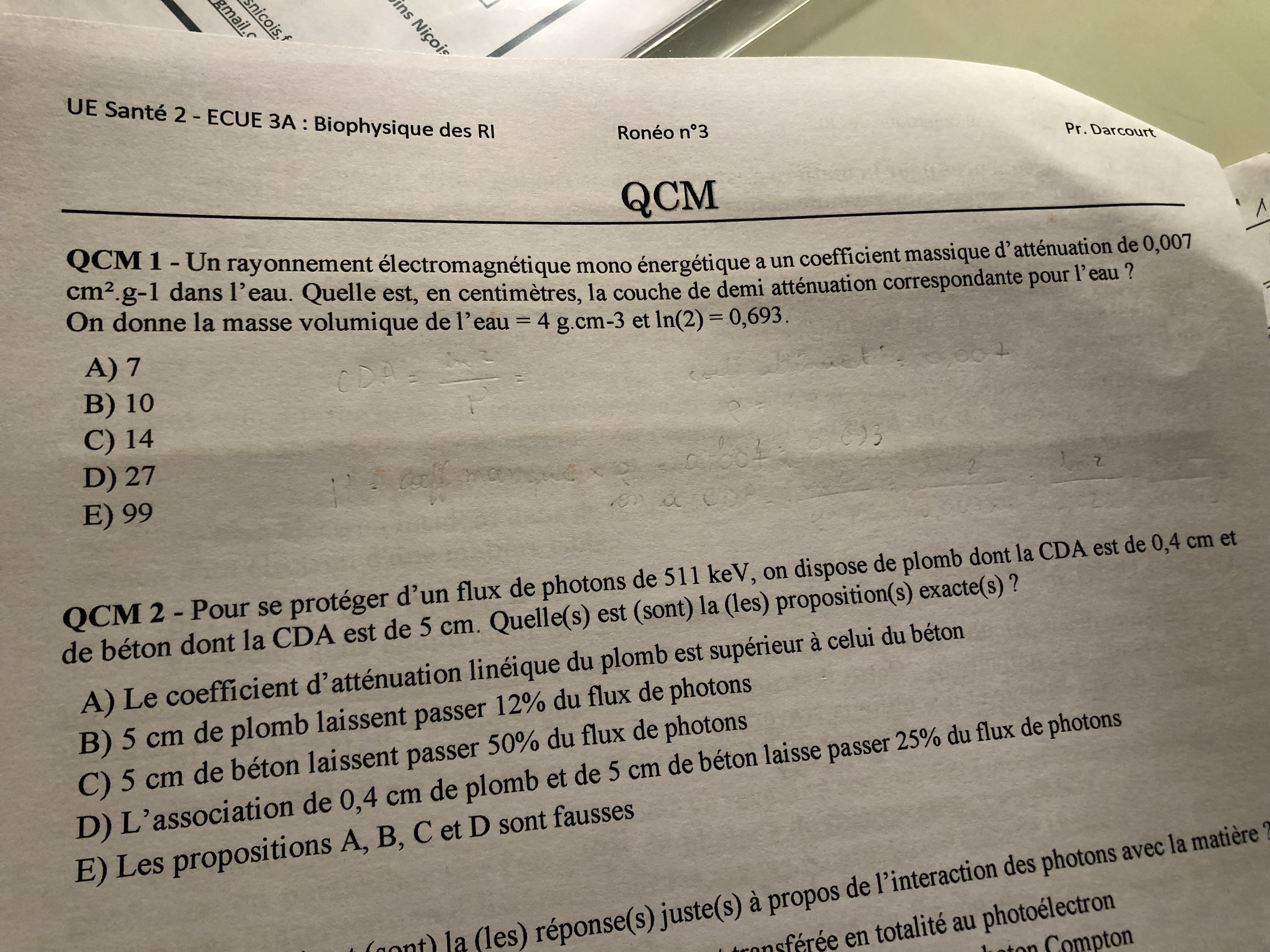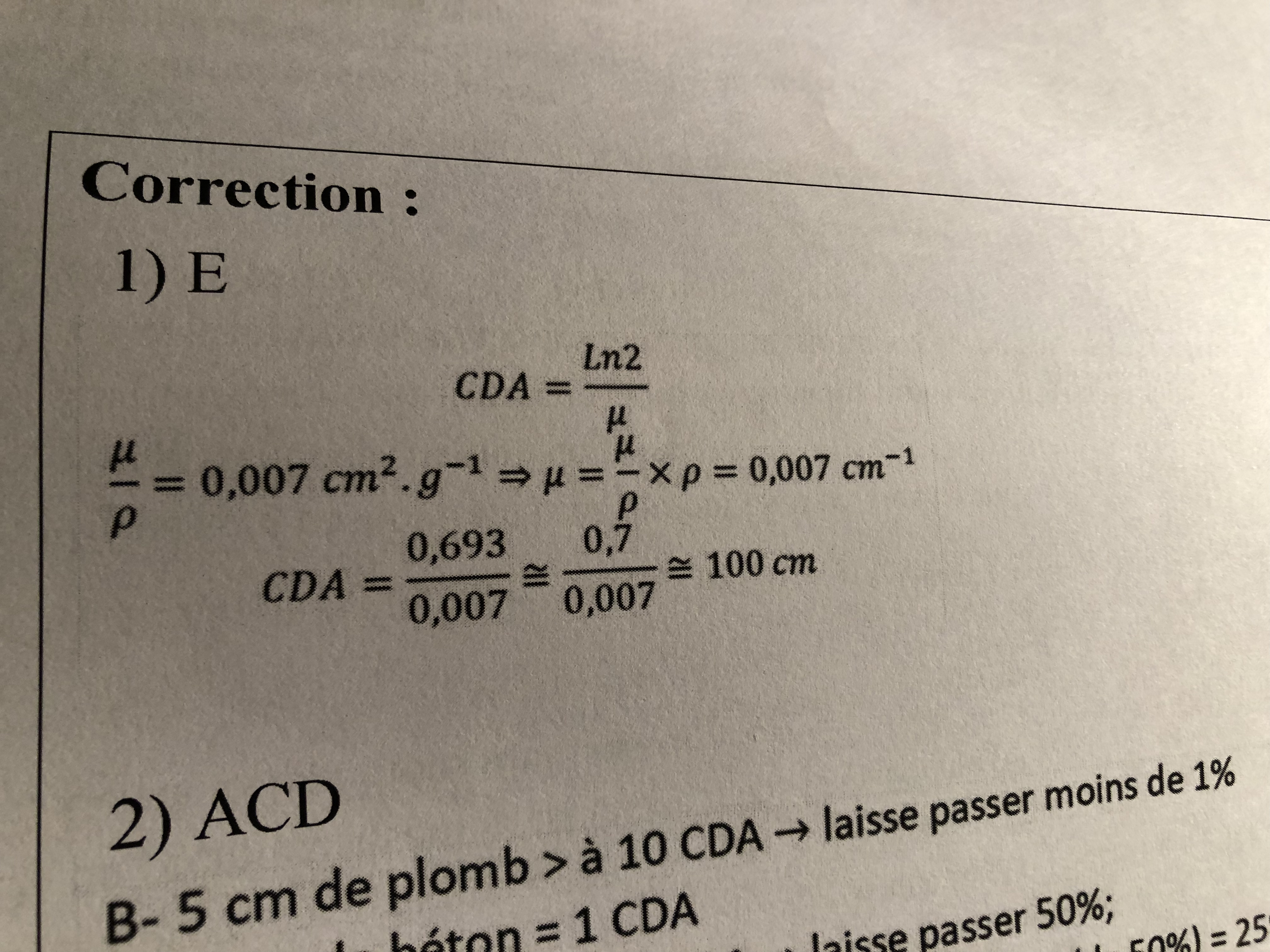 Coucou! Je ne comprends pas la correction d’un qcm du prof, cours 2. On a ici le coefficient massique et dans la correction j’ai l’impression qu’on ne le transforme pas en coefficient linéique. Or c’est bien le coefficient linéique dans la formule? Merci de votre aide