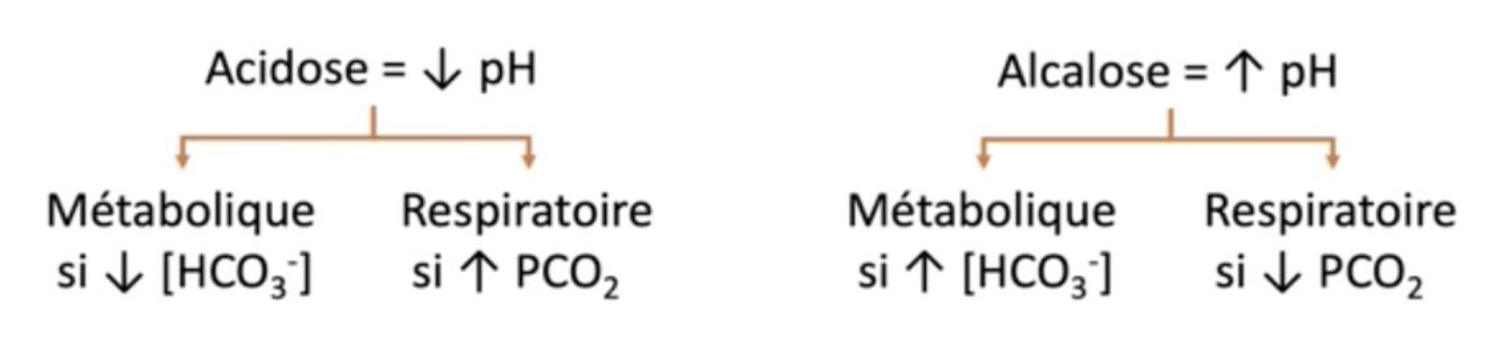 Ensuite : Acidose : - métabolique si HCO3- diminué (<22 mmol/L) - respiratoire si PCO2 augmenté (>44 mmHg) Alcalose : - métabolique si HCO3- augmenté (>26 mmol/L) - respiratoire si PCO2 diminué (<36 mmHg)