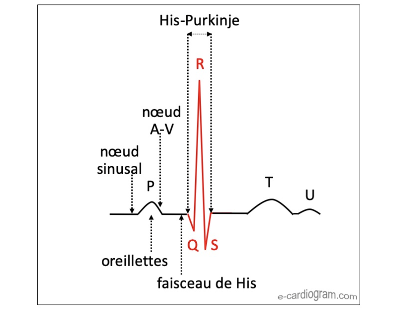 PR (ou PQ c'est quasiment pareil): L’intervalle PR représente le temps que prend le passage du stimulus depuis le début de la dépolarisation auriculaire (onde P) jusqu’à ce que commence la dépolarisation ventriculaire (QRS).