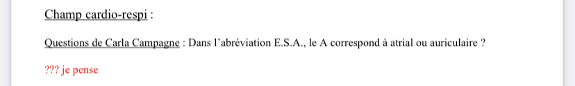 Alors atrium = oreillette mais l'auricule est une partie de l'atrium (ou de l'oreillette). Le professeur dit dans sa vidéo il me semble que c'est auriculaire mais quand on cherche sur internet "ESA" on parle d'extra systole atriale. Je pense pas que le professeur piège sur ça, mais nous lui poserons la question pour avoir plus de précisions. : )))