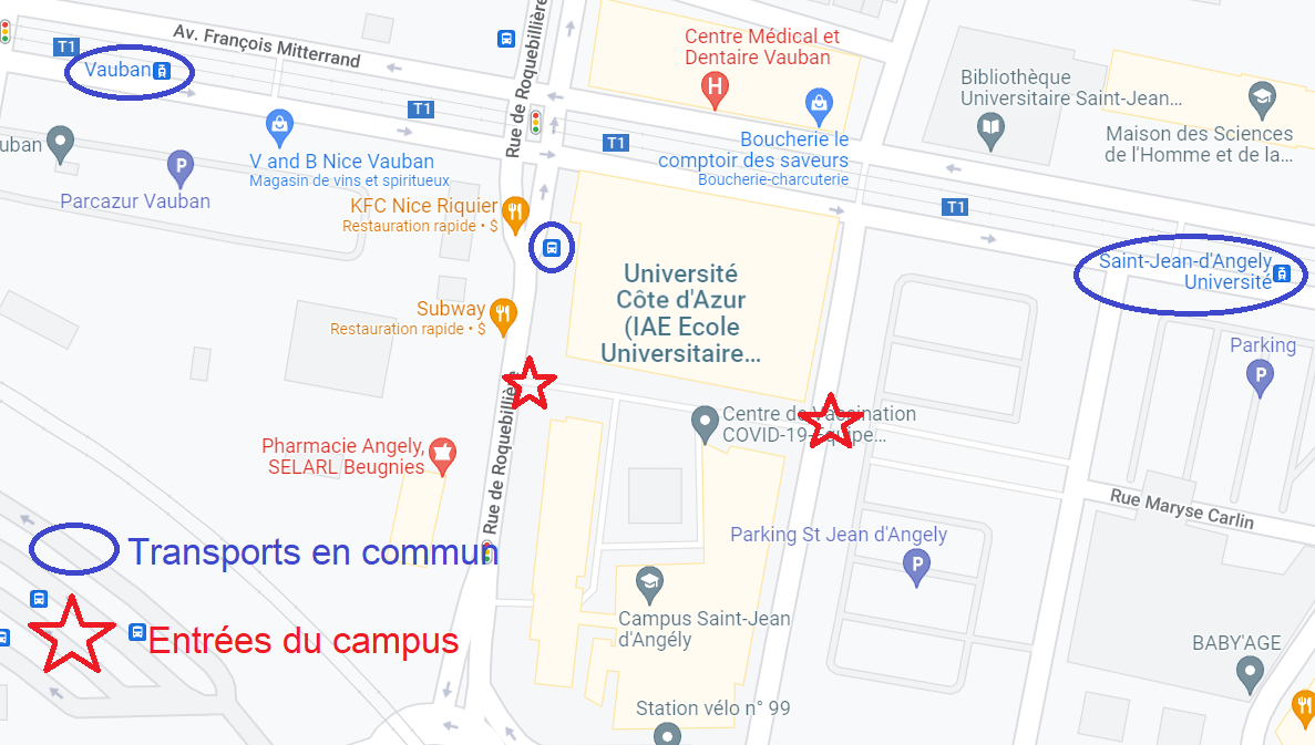 Prendre la ligne T1 "Henri Sappia - Hôpital Pasteur", descendre à l'arrêt "Vauban" ou "Sant-Jean d'Angély Université" (c'est à la même distance), puis se rendre jusqu'au campus.