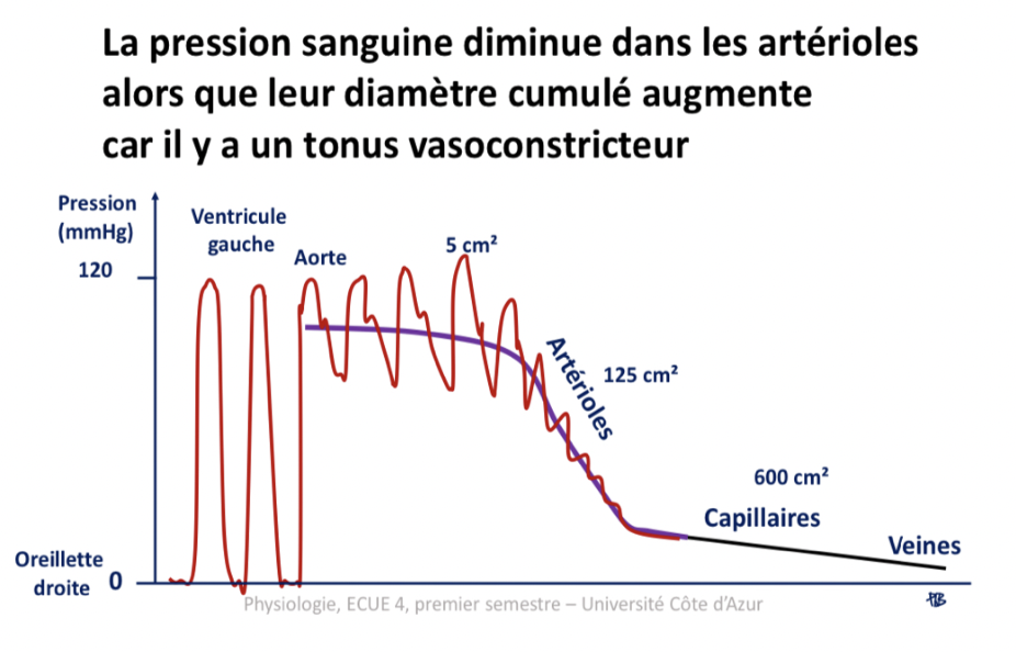 1) La phrase au-dessus du schéma qui indique que "la pression sanguine diminue dans les artérioles car il y a un tonus vasoconstricteur", donc je pense que le prof a voulu insister sur cette notion