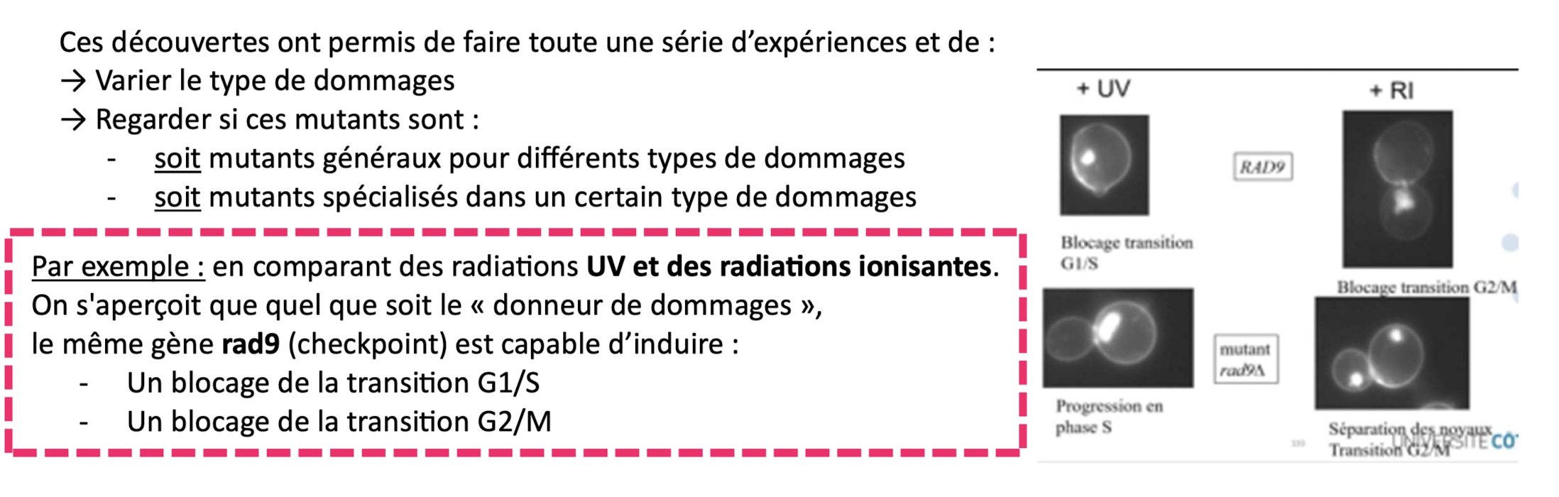 j'ai compris que RAD9 est impliqué dans le checkpoint car quand il est muté, le checkpoint ne fait plus son rôle et donc la cellule continue son cycle avec toutes ses anomalies et finit par mourir
