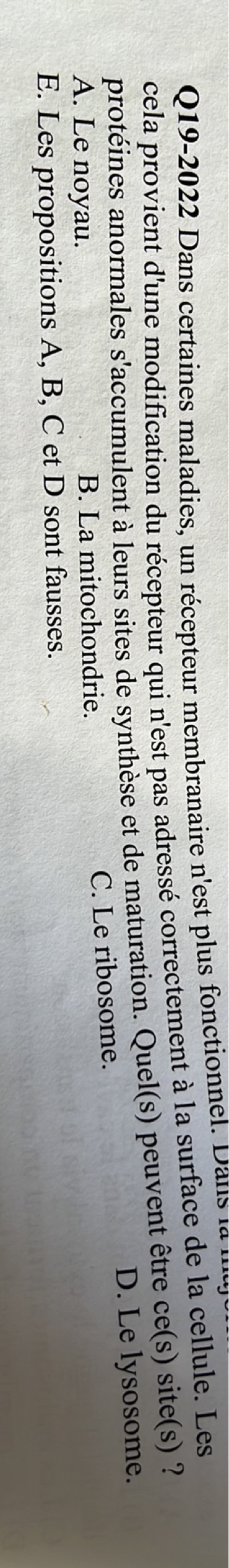 dans le qcm 19 de l'année dernière, dans certaine maladies, un récepteur membranaire n'est plus fonctionnel. Dans la majorité des cas, cela provient d'une modification du récepteur qui n'est pas adressé correctement à la surface de la cellule. Les protéines anormales s'accumulent à leurs sites de synthèse et de maturation. Quel peuvent être ces site?