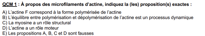 L'item C indique la myosine a un rôle structural. Celui-ci est compté faux, avec la justification précisant que la myosine a un rôle moteur.