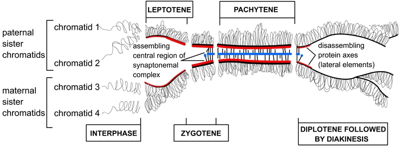-Stade zygotène : mise en place des complexes synaptonémaux (j'ai plus détaillé dans un autre post, il y a mise en place et leur structure n'est pas tout a fait finit, elle change et reste en place jusqu'au stade diacinèse)