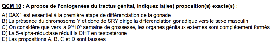 L'item A dit : "DAX1 est essentiel à la première étape de différenciation de la gonade". Celui-ci est compté faux, avec comme justification : "détermination++".
