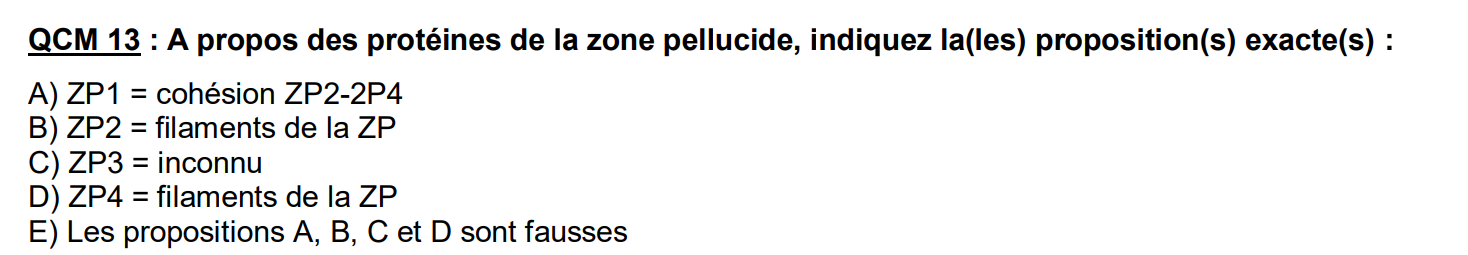 J'aimerai comprendre pourquoi dans la correction on nous dit que la réponse est E ? Moi j'avais mis B, dans la fiche il est clairement dit que ZP2 et ZP3 donnent les filaments de la ZP. Peut-être une errata ?