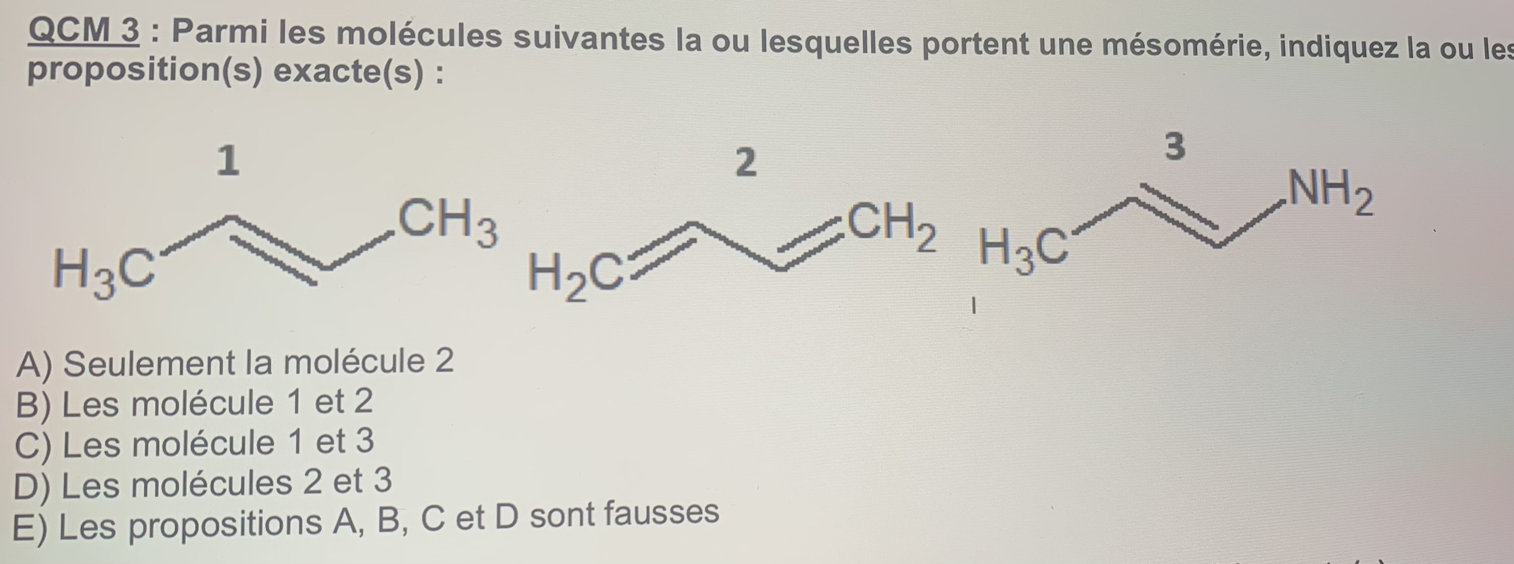 Pouvez vous m’expliquer svp pourquoi la molécule 1 ne porte pas de mésomérie alors que je vous qu’il y’a un atome relié à sigma pi sigma et atome ?
